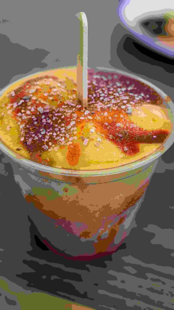 While RVing through upstate New York, I stumbled upon a vendor selling what looked like a vibrant yellow-orange smoothie with reddish lines decorating the inside of the plastic cup. The rim was coated in a reddish seasoning that looked both salty and spicy. A tamarind stick poked out from the top, catching my eye.