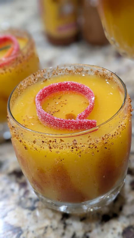 A mangonada (also called chamango, mangoneada, or mango loco) is a frozen mango smoothie with layers of spicy and sour flavors. Its trademark appearance features a bright yellow-orange mango base streaked with deep red lines of chamoy sauce and topped off with a tamarind candy stick. The rim of the cup is dipped in a salty, chili-lime seasoning, giving each sip a perfect balance of sweet, tart, and spicy.